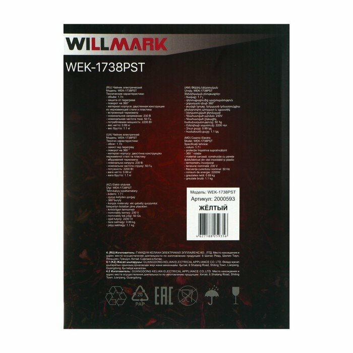 Чайник электрический Willmark Wek-1738pst, пластик, колба металл, 1.7 л, 2200 Вт, жёлтый Willmark 92