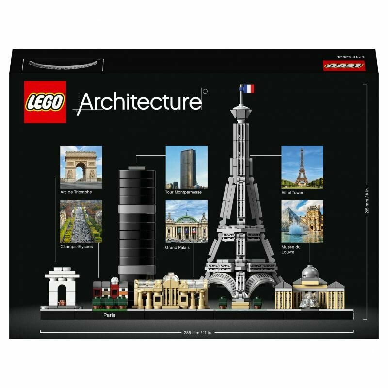 | Дополнительная информация | В буклете, входящем в набор, предоставлена информация о дизайнере, архитектуре и истории каждого здания, а также исторические факты о Париже и его архитектурном наследии. (Только на французском и английском языке. Информация на других языках доступна на сайте LEGO.com/architecture.) В набор входит базовая пластина 4х32 и декоративная табличка с названием города Парижа. Размеры модели: более 22 см в высоту, 28 см в длину и 11 см в ширину. |