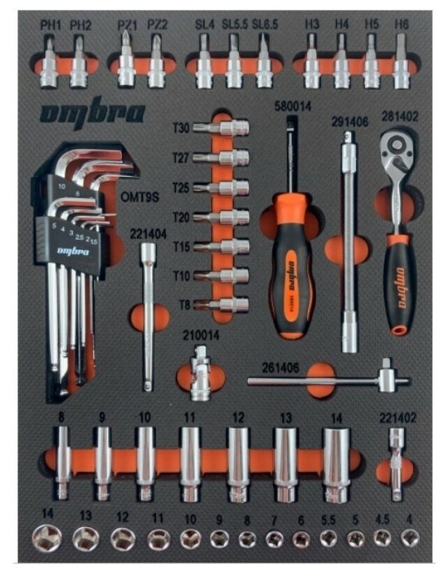 OMBRA OMT54STE Набор головок 1/4" 54 пр. 6 гр. 4-14 мм с аксессуарами EVA ложемент 280 х 375 мм Ombra