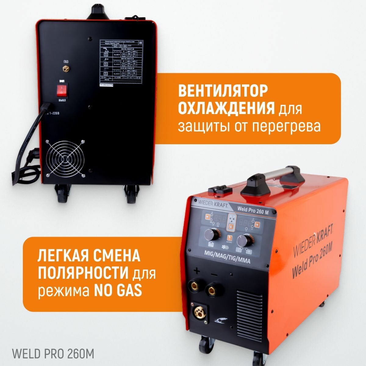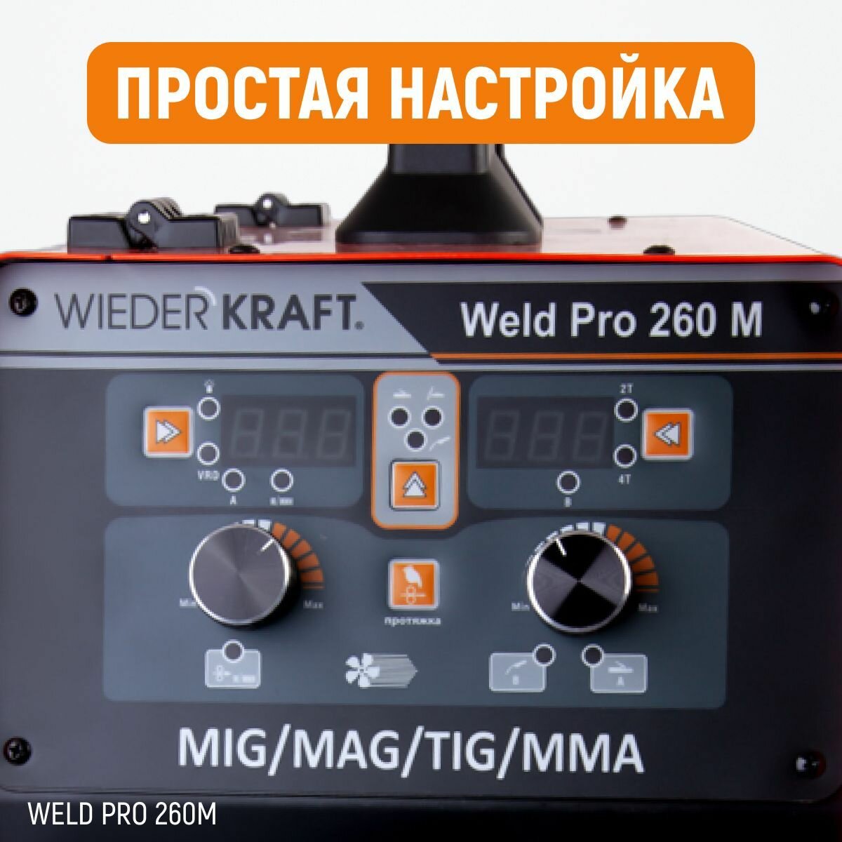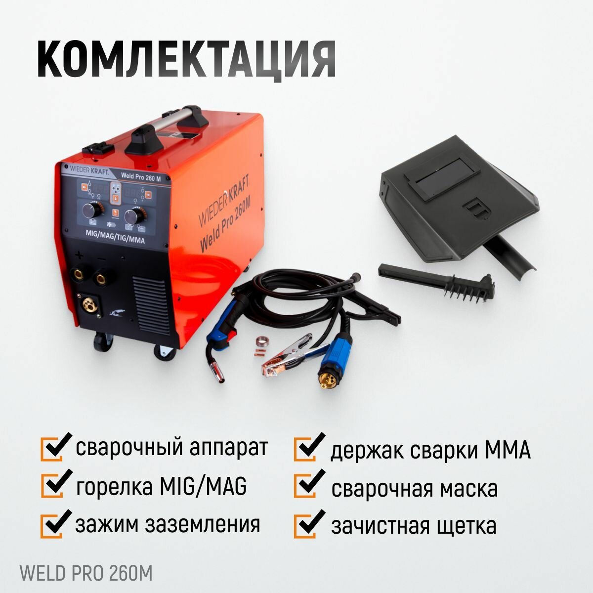 WIEDERKRAFT Сварочный аппарат инверторный 260A 220В MIG/MAG/MMA/Lift TIG с горелкой Weld Pro 260M