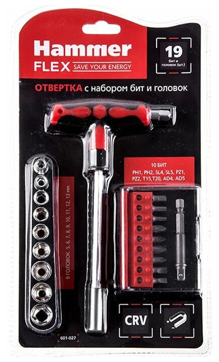 Отвертка Hammer "Flex", с набором бит и головок, Т-образная рукоятка, CRV, 20 предметов. 601-027