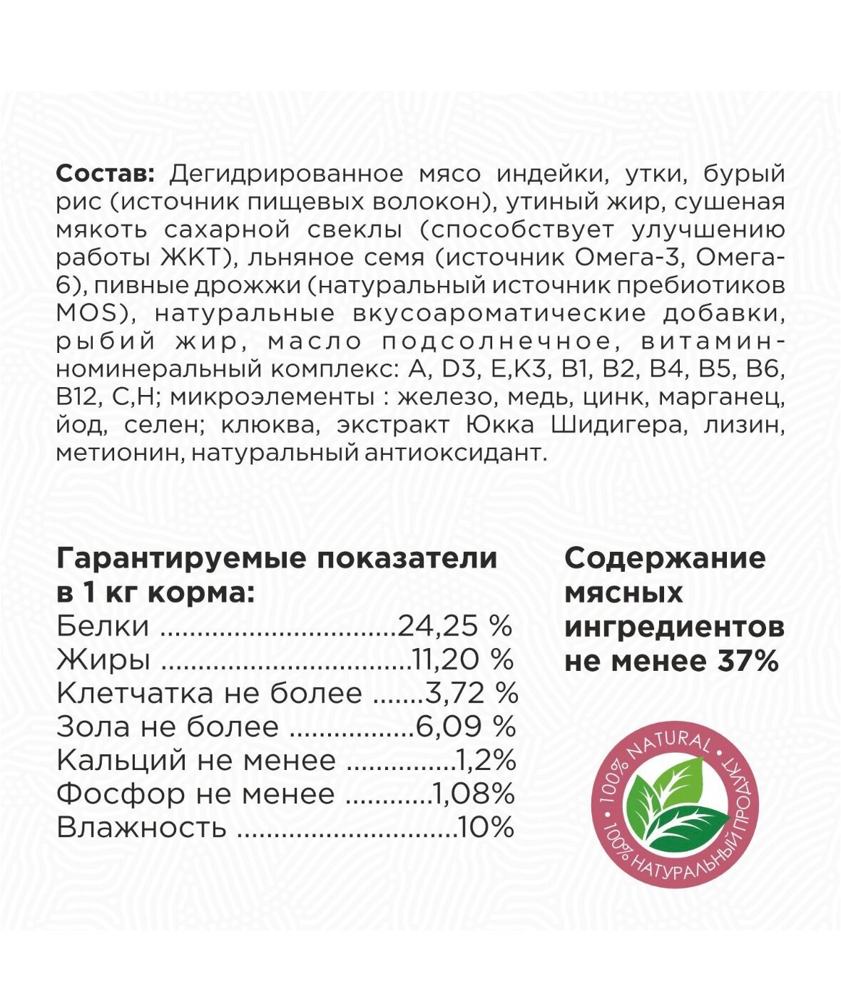 | Состав | Дегидрированное мясо индейки, утки , бурый рис (источник пищевых волокон), утиный жир, сушеная мякоть сахарной свеклы (способствует улучшению работы ЖКТ), льняное семя (источник Омега-3, Омега-6), пивные дрожжи (натуральный источник пребиотиков MOS), натуральные вкусоароматические добавки, рыбий жир, масло подсолнечное, клюква, экстракт Юкка Шидигера, лизин, метионин, натуральный антиоксидант. Содержание мясных ингредиентов не менее 30%. |