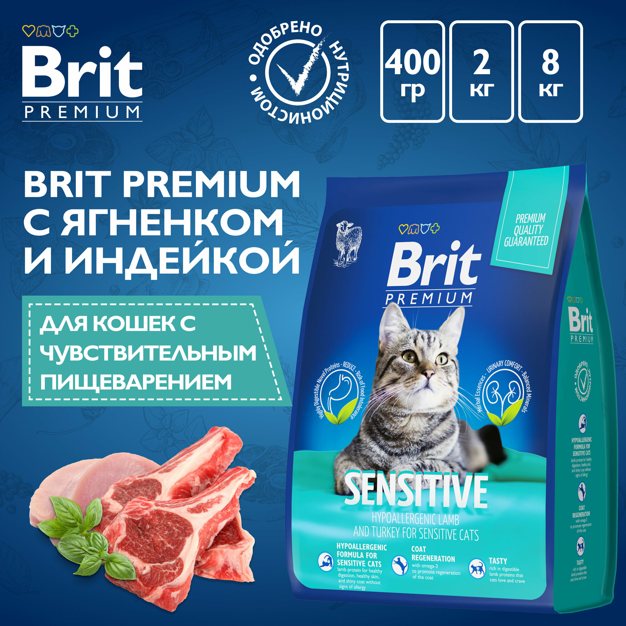 Brit Premium Cat Sensitive 8кг ягненок и индейка сухой корм при чувствительном пищеварении для кошек
