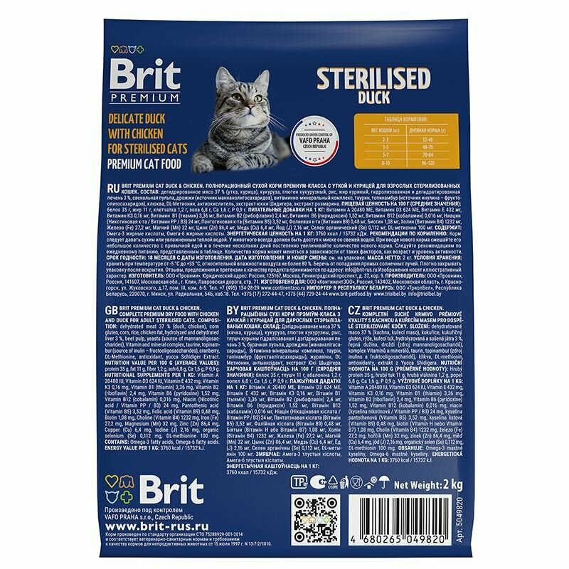 Сухой корм для стерилизованных кошек Брит Премиум с уткой и курицей, 2 кг