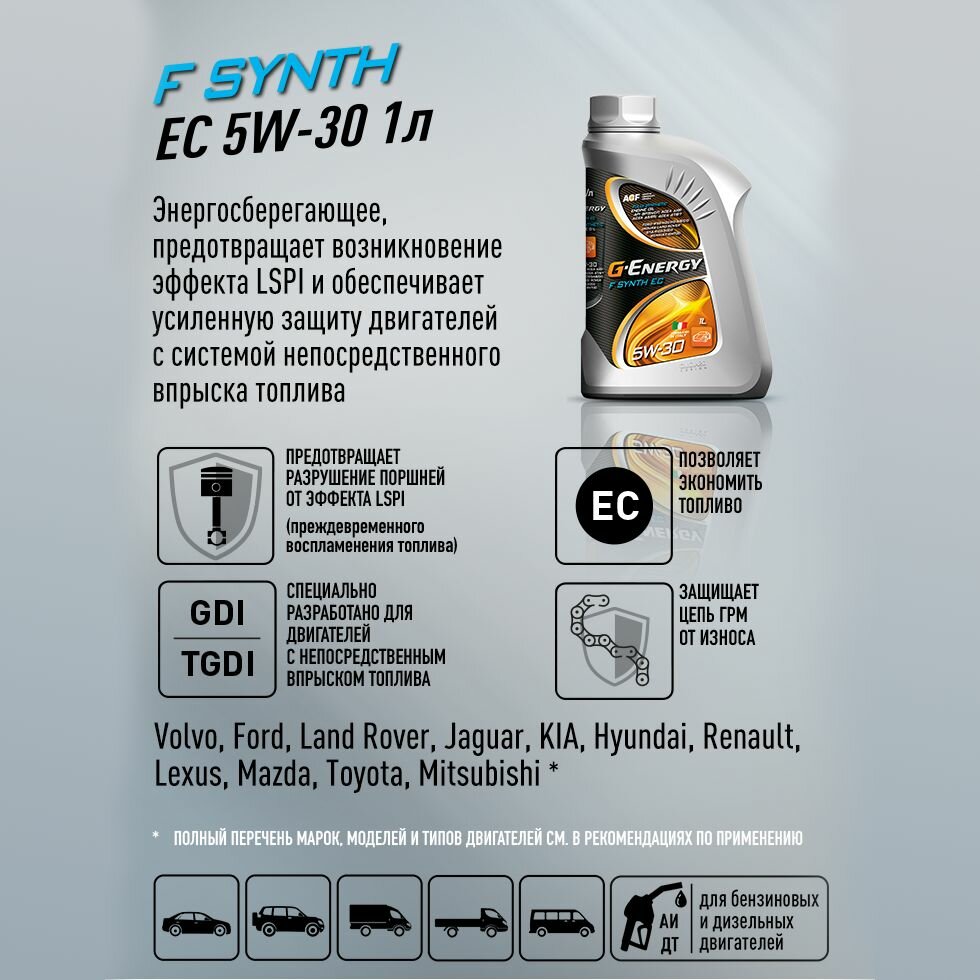 Ниже Вы можете прочитать отзывы на Масло G-Energy "F Synth EC 5W-30" 1л Синтетическое, ознакомится с подробными характеристиками, посмотреть интересные обзоры и фотографии на Масло G-Energy "F Synth EC 5W-30" 1л Синтетическое.