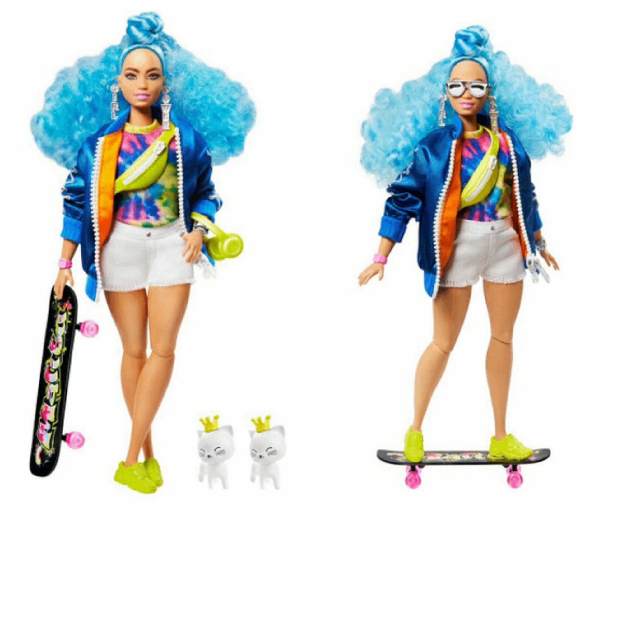 | Дополнительная информация | аксессуары: скейтборд с надписью “Малибу” и розовыми колесами, неоново-зеленые кроссовки, поясная сумка, серебристые солнцезащитные очки, серьги Girl Power и наушники; две фигурки котят с игривыми мордочками и мини-коронами можно поставить на скейтборд вместе с Барби |