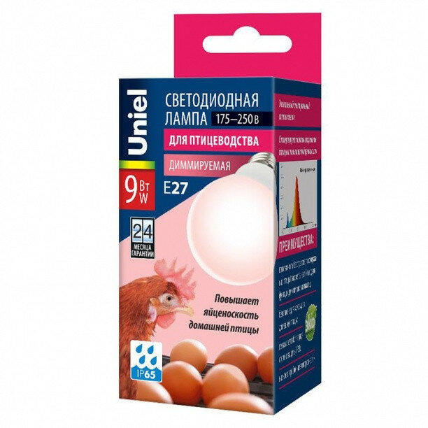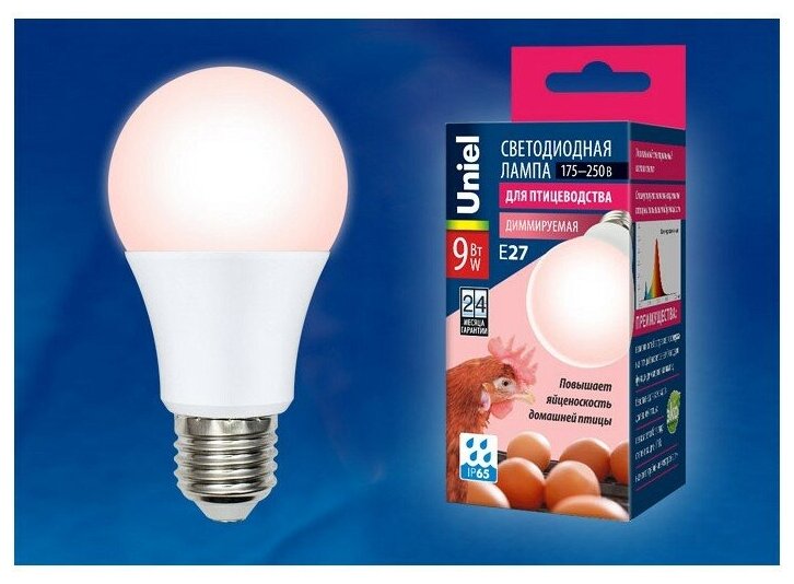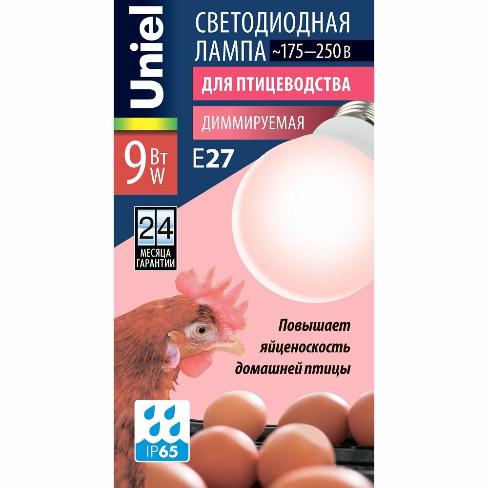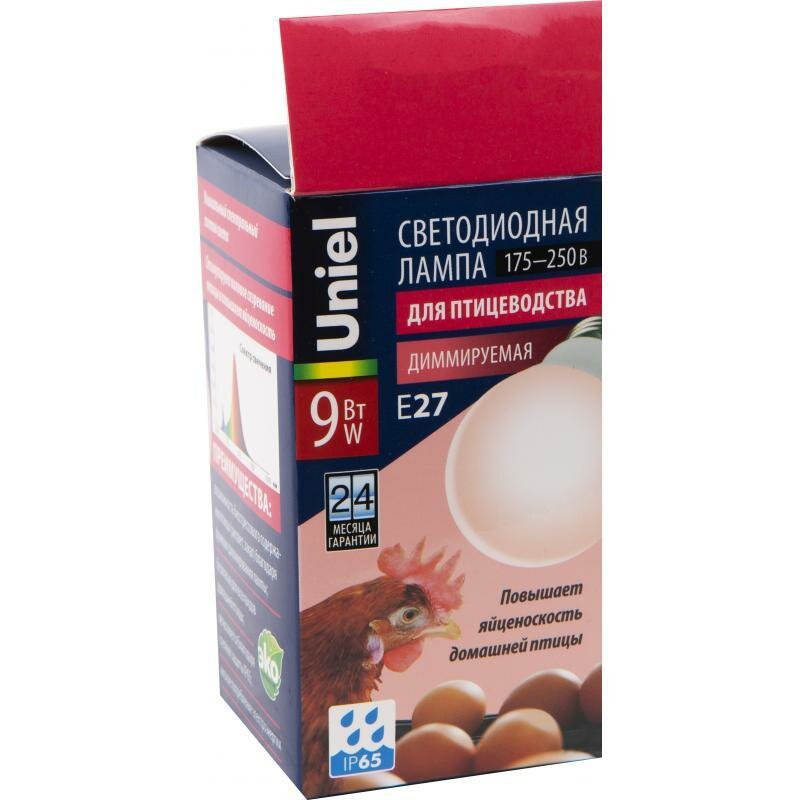 Светодиодная лампа для птиц Uniel LED-A60-9W/SCEP/E27/FR/DIM IP65 PLO65WH спектр для яйценоскости, диммируемая