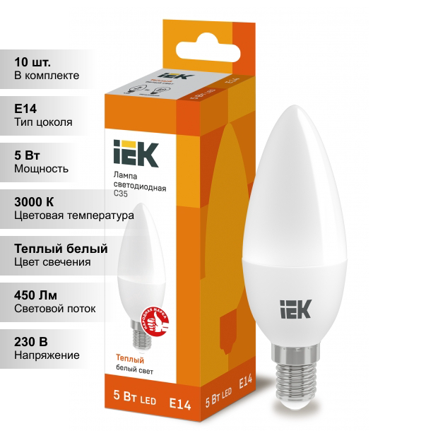 Купить Лампочка Светодиодная IEK Свеча 5Вт 230В E14 C35 450Лм 3000К LLE-C35-5-230-30-E14, упаковка 10шт.