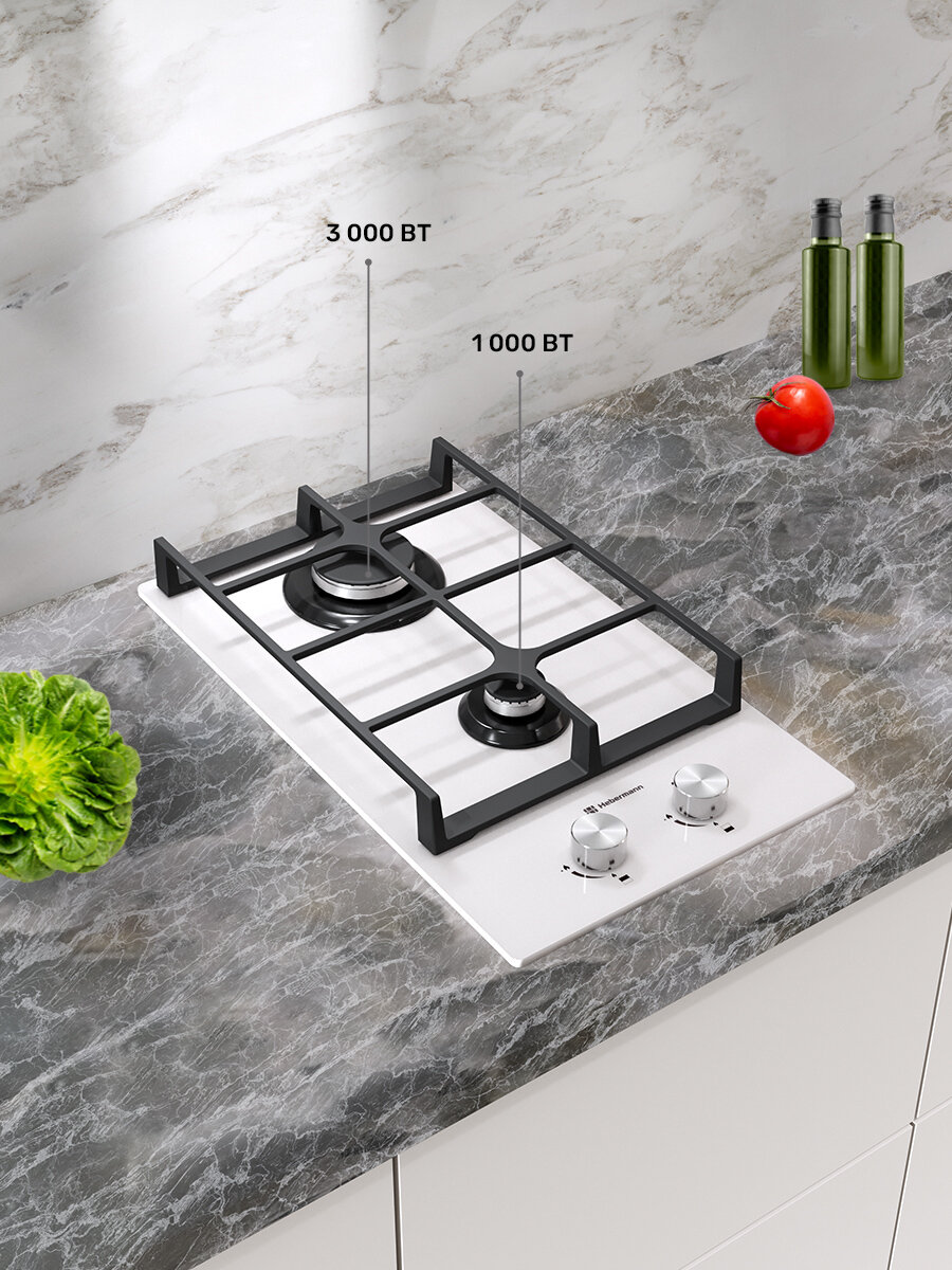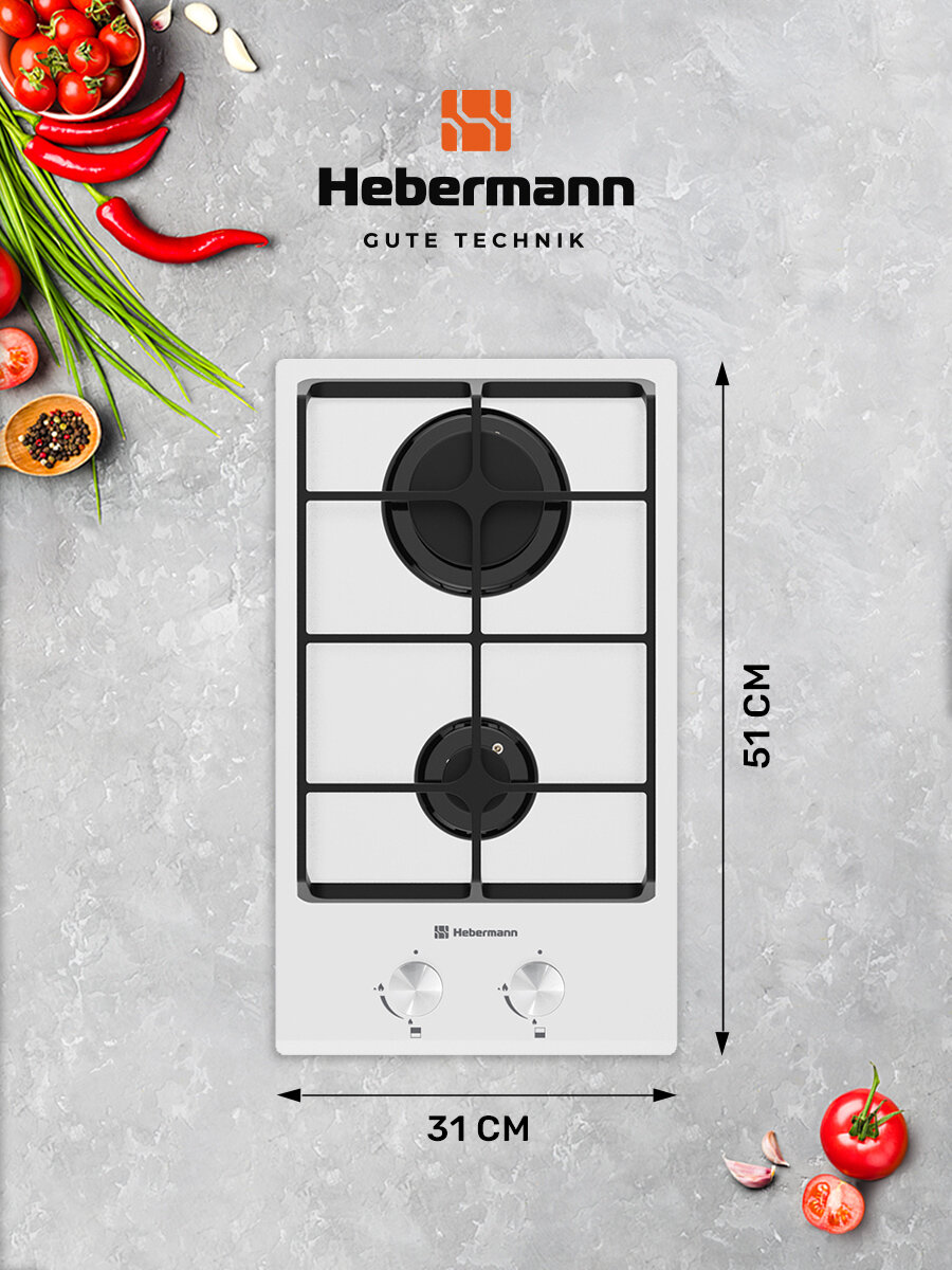 Газовая варочная панель Hebermann HBGG 302.1 W, ширина 31 см. закаленное стекло, 2 конфорки, 4000 Вт