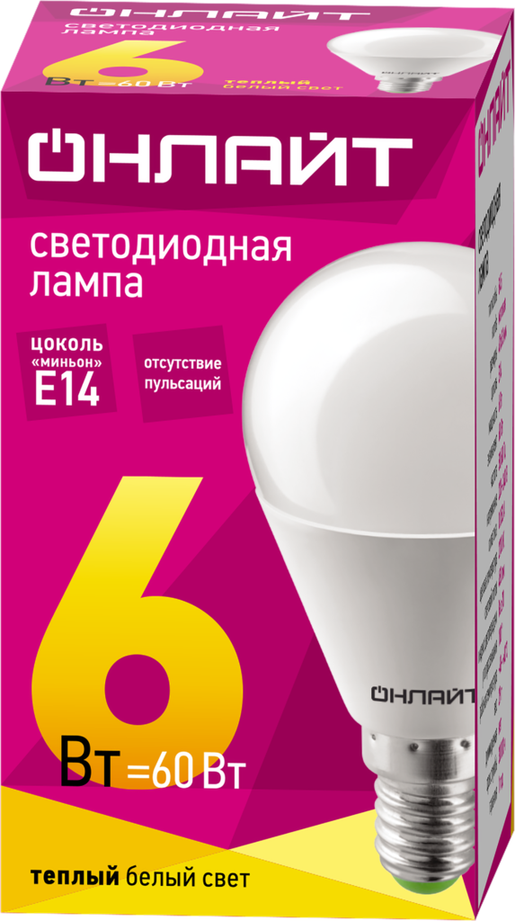 Лампа светодиодная онлайт 71643, E14, G45, 6 Вт, 2700 К