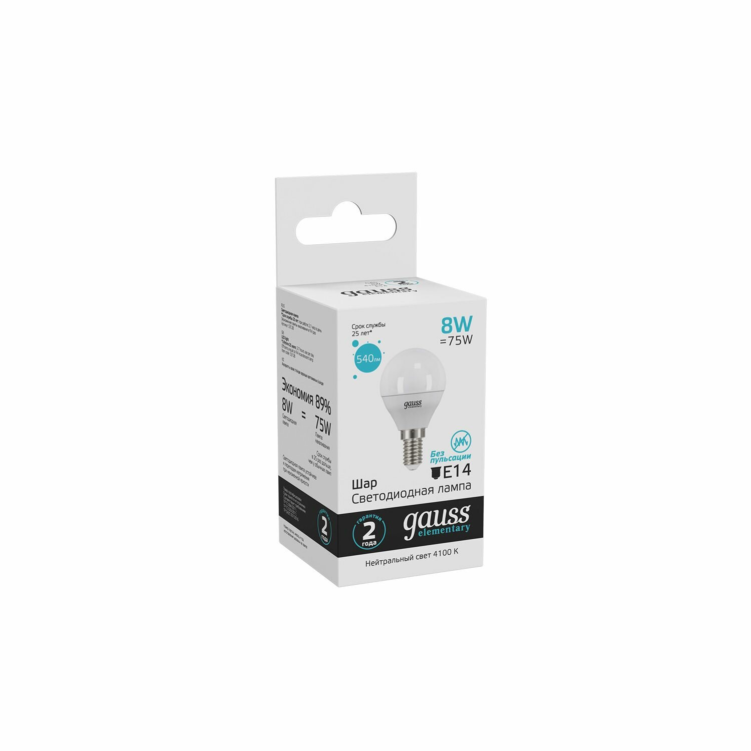 Лампа светодиодная Elementary 8Вт шар 4100К нейтр. бел. E14 540лм, GAUSS 53128 (1 шт.)