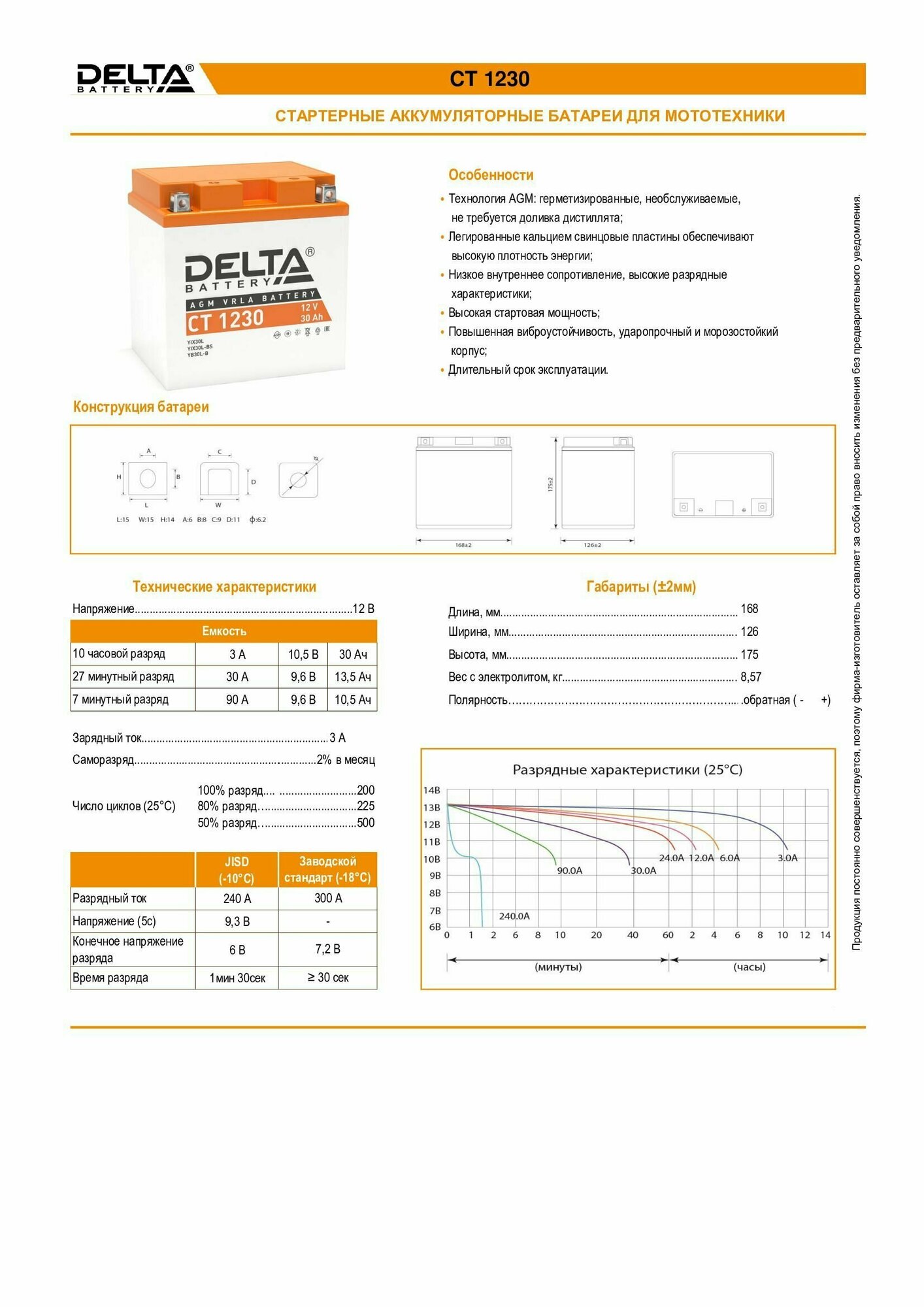 Мото аккумулятор стартерный Delta CT 1230 12В 30Ач прямая полярность 300А, AGM, аккумулятор для мотоцикла, мопеда, скутера, квадроцикла, снегохода, генератора