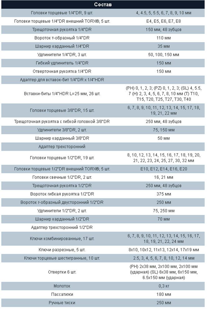 | Головки торцевые подробно | 1/4": 4, 4.5, 5, 5.5, 6, 7, 8, 9, 10 мм; Torx 1/4": E4, E5, E6, E7, E8; трещотка 1/4": 48 зубов; вороток т-образный 1/4": 110 мм; карданный шарнир 1/4"; удлинитель 1/4": 50, 100, 150 мм; гибкий удлинитель 1/4": 150 мм; 3/8": 6, 7, 8, 9, 10, 11, 12, 13, 14, 15, 17, 18, 19, 21, 22 мм; трещотка 3/8": 48 зубов; удлинитель 3/8": 75, 150 мм; карданный шарнир 3/8"; 1/2": 8, 10, 12, 13, 14, 15, 16, 17, 18, 19, 20, 21, 22, 23, 24, 25, 27, 30, 32 мм; Torx 1/2": E10, E12, E14, E16, E20; свечные 1/2": 16, 21 мм; трещотка 1/2": 48 зубов; удлинитель 1/2": 75, 250 мм; карданный шарнир 1/2" |