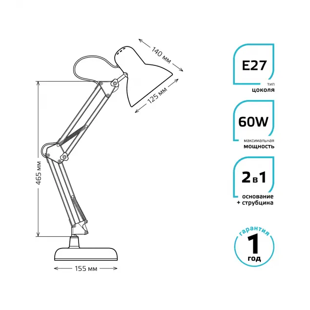 Настольная лампа GAUSS GTL002 60W 220-240V E27 черный струбцина и основание 1/12