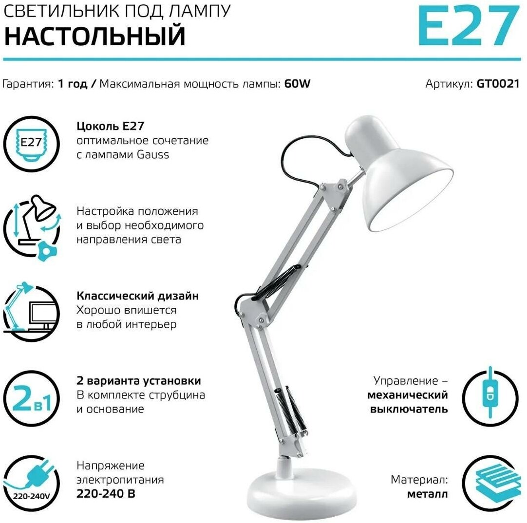 Купить Светильник настольный Gauss GTL002 60W 220-240V E27 белый струбцина и основание