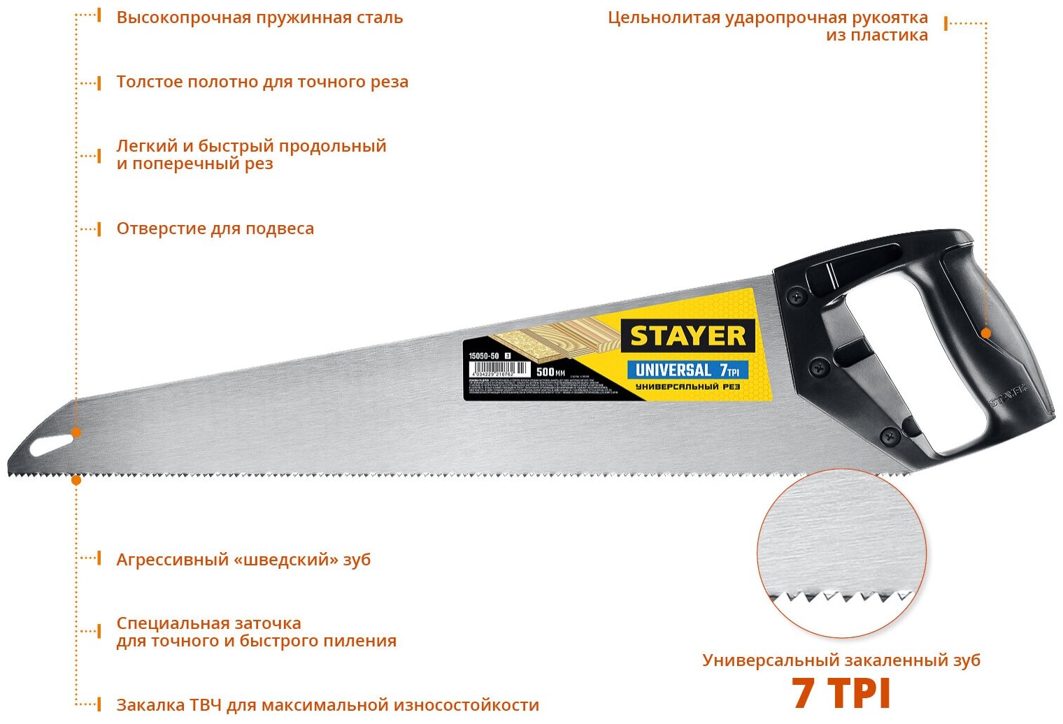 Ножовка универсальная STAYER (пила) Universal, 500мм,7TPI, закаленный зуб, рез вдоль и поперек волокон, д (1шт) (15050-50_z03)