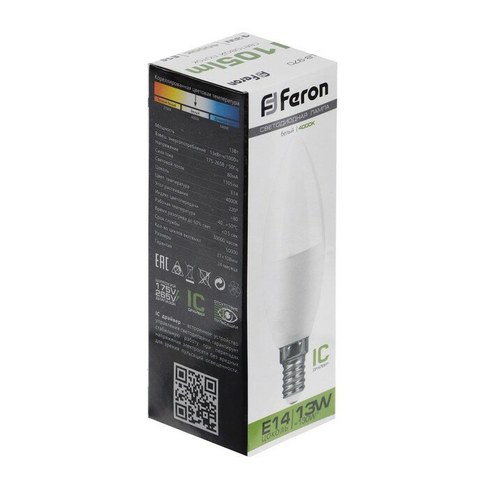 10шт/уп. Лампа LED Свеча 13Вт 230B C37 E14 1105Лм 4000К Свет Нейтральный белый арт. 38108 Feron, уп. 10шт