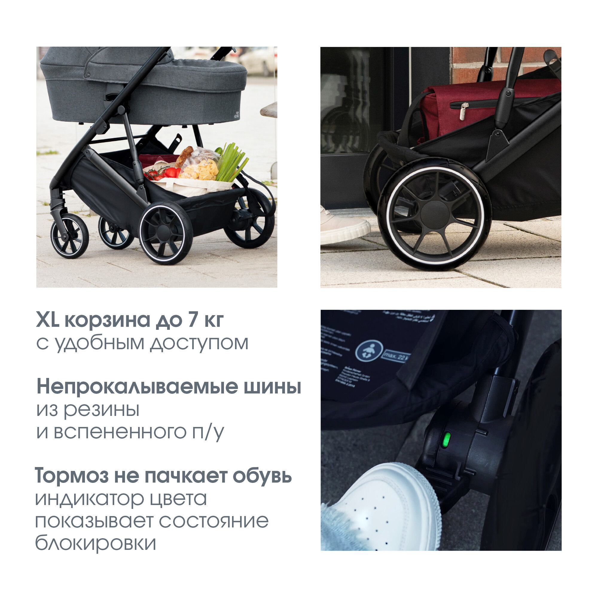 | Особенности шасси | корзина для покупок / перестановка блока лицом/спиной / регулировка высоты ручки / съемные колеса |