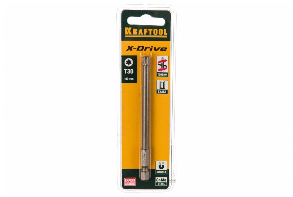 Биты ″X-DRIVE″ торсионные кованые, обточенные, KRAFTOOL 26125-30-100-1, Cr-Mo сталь, тип хвостовика E 1/4″, Т30, 100мм, 1шт