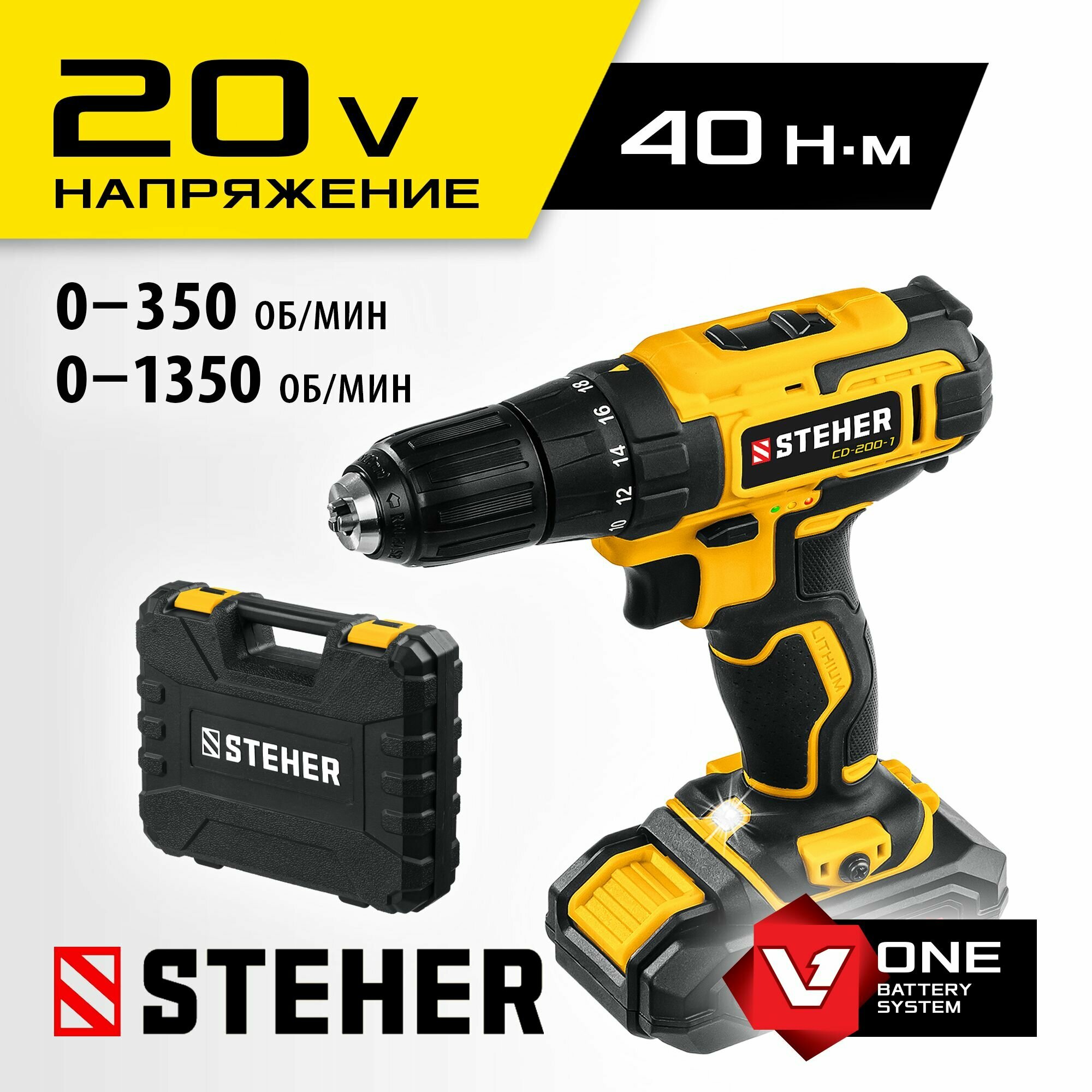 STEHER V1, 20 В, 40 Н·м, 1 АКБ (2 А·ч), дрель-шуруповерт, кейс (CD-200-1)