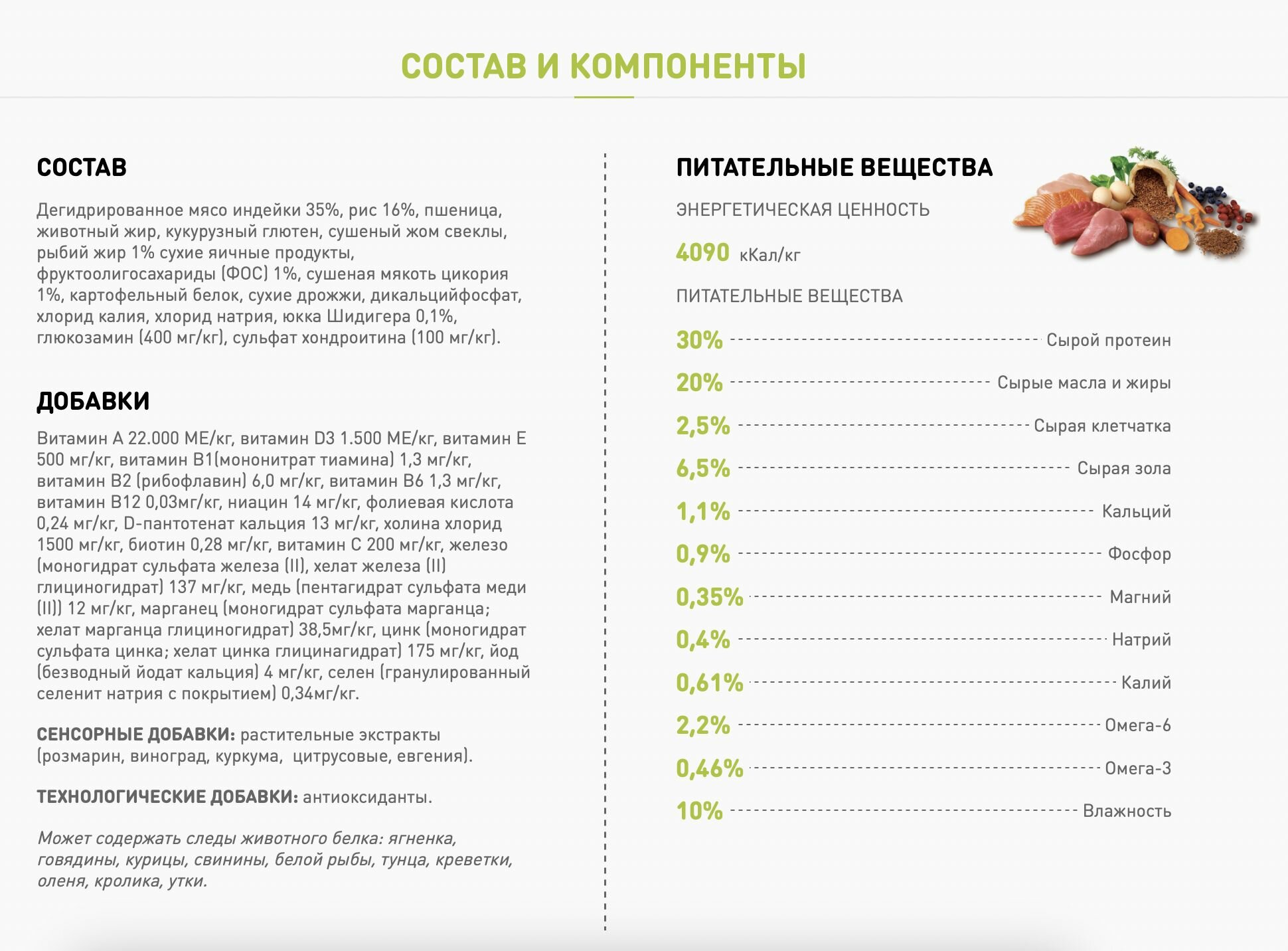 | Состав | дегидрированное мясо (индейка 22%), рис 16%, кукуруза, животный жир, кукурузный глютен, ячмень, сушеный жом свеклы (3%), рыбий жир 1%, фруктоолигосахариды 1%, сушеный корень цикория 1%, сухие дрожжи, сухое яйцо, дикальция фосфат, калия хлорид, натрия хлорид, юкка шидигера 0,1%, глюкозамин (400 мг/кг), хондроитина сульфат (100 мг/кг), биологический комплекс растительных экстрактов 0.03% (гвоздика, цитрусовые, виноградная лоза, розмарин, куркума) |