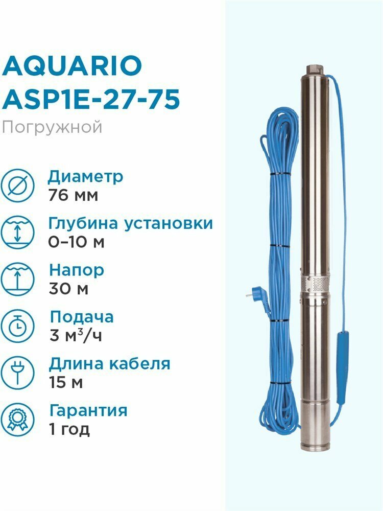 Скважинный насос AQUARIO ASP1E-27-75 ( Кабель 15м, Hmax напор-30м, Qmax расход-50л/м)