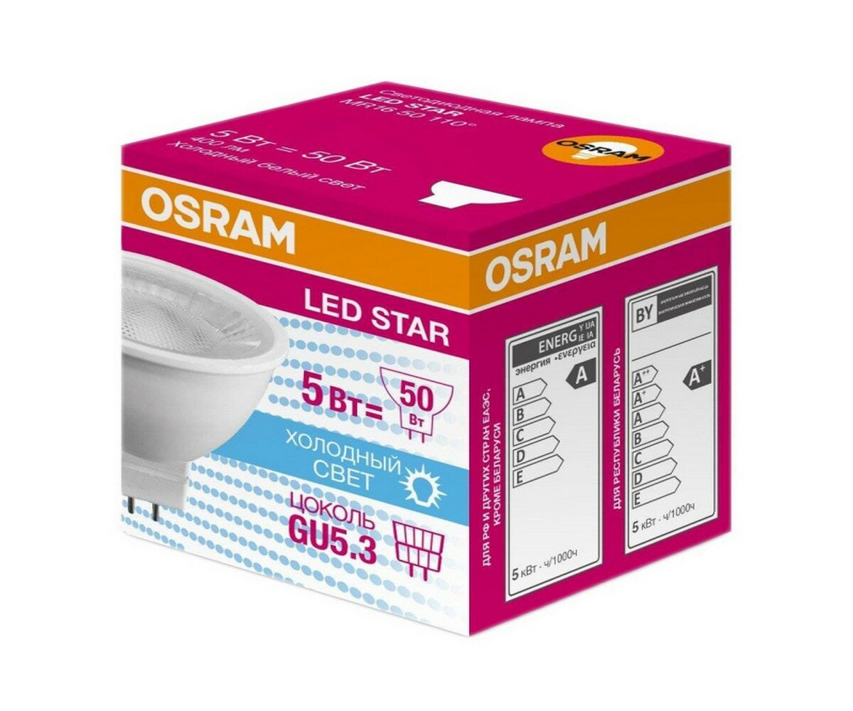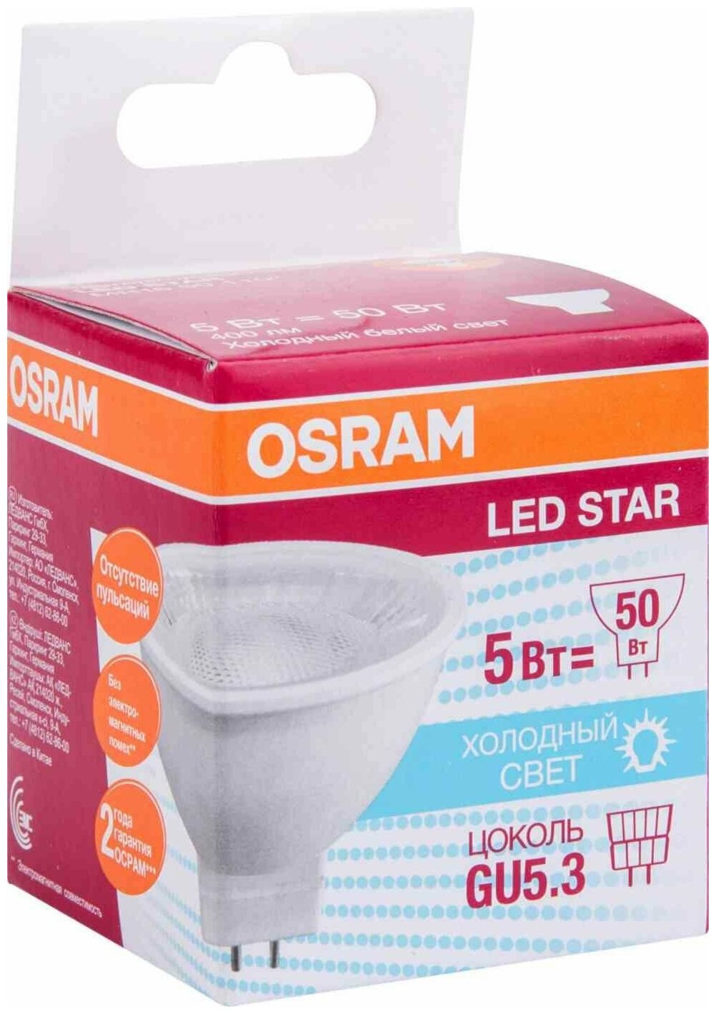 2шт/уп. Лампа LED Софит 5Вт 220-240В GU5.3 MR16 400Лм 6500К Угол 110 град. d 50mm h 46mm Свет Холодный белый Osram, уп. 2шт