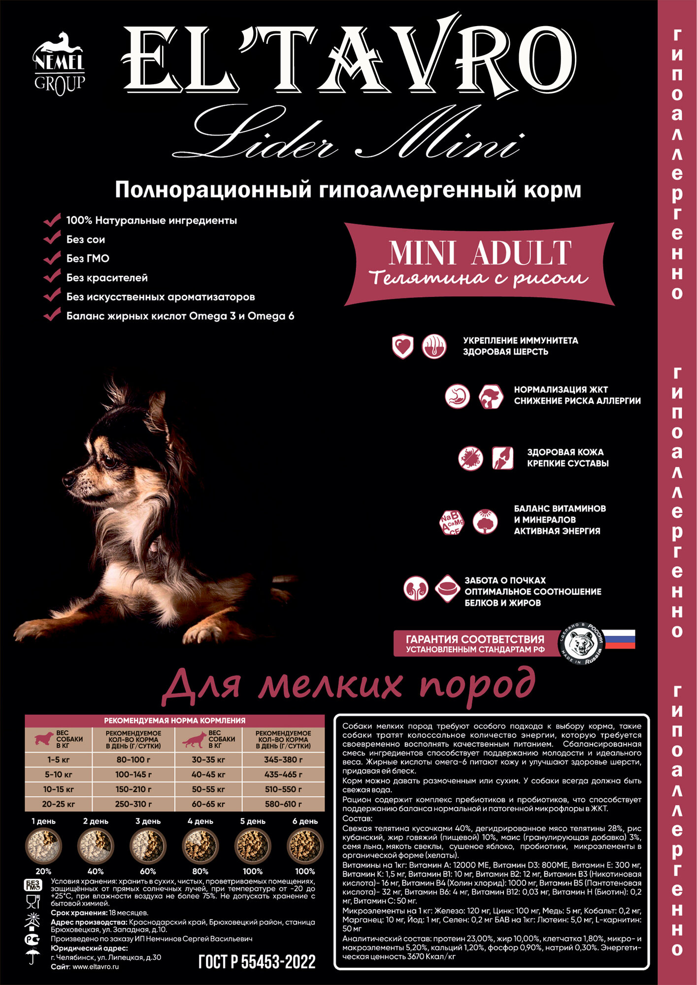 | Состав | Свежая телятина кусочками 40%, дегидрированное мясо телятины 20%, рис кубанский, жир говяжий (пищевой) 10%, маис (гранулирующая добавка) 3%, семя льна, мякоть свеклы, сушеное яблоко, пробиотики, микроэлементы в органической форме (хелаты). |