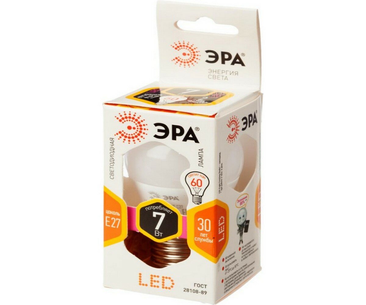 ЭРА Б0020550 Лампа светодиодная ЭРА LED P45-7W-827-E27 (диод, шар, 7Вт, тепл, E27)