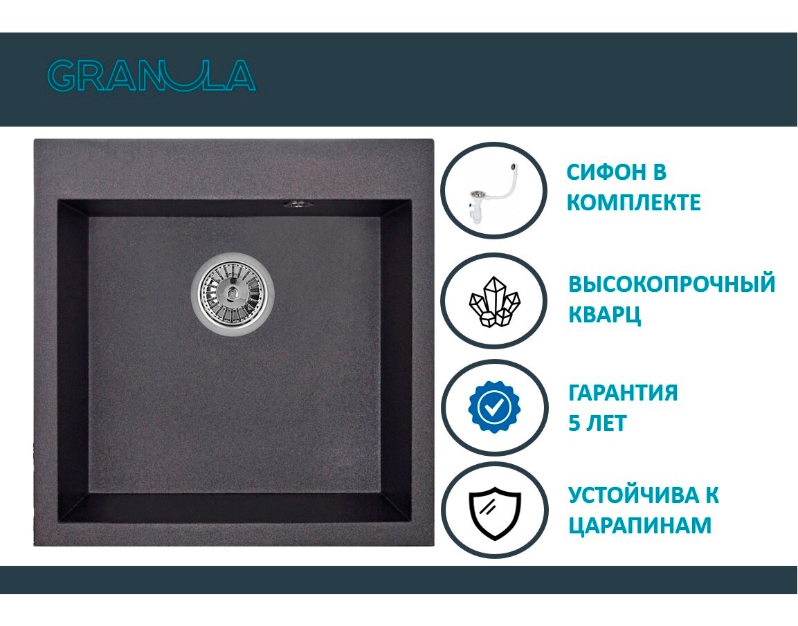 Мойка для кухни врезная кварц GRANULA 51x52x20 Кухонная раковина в комплекте с сифоном. Цвет черный металлик