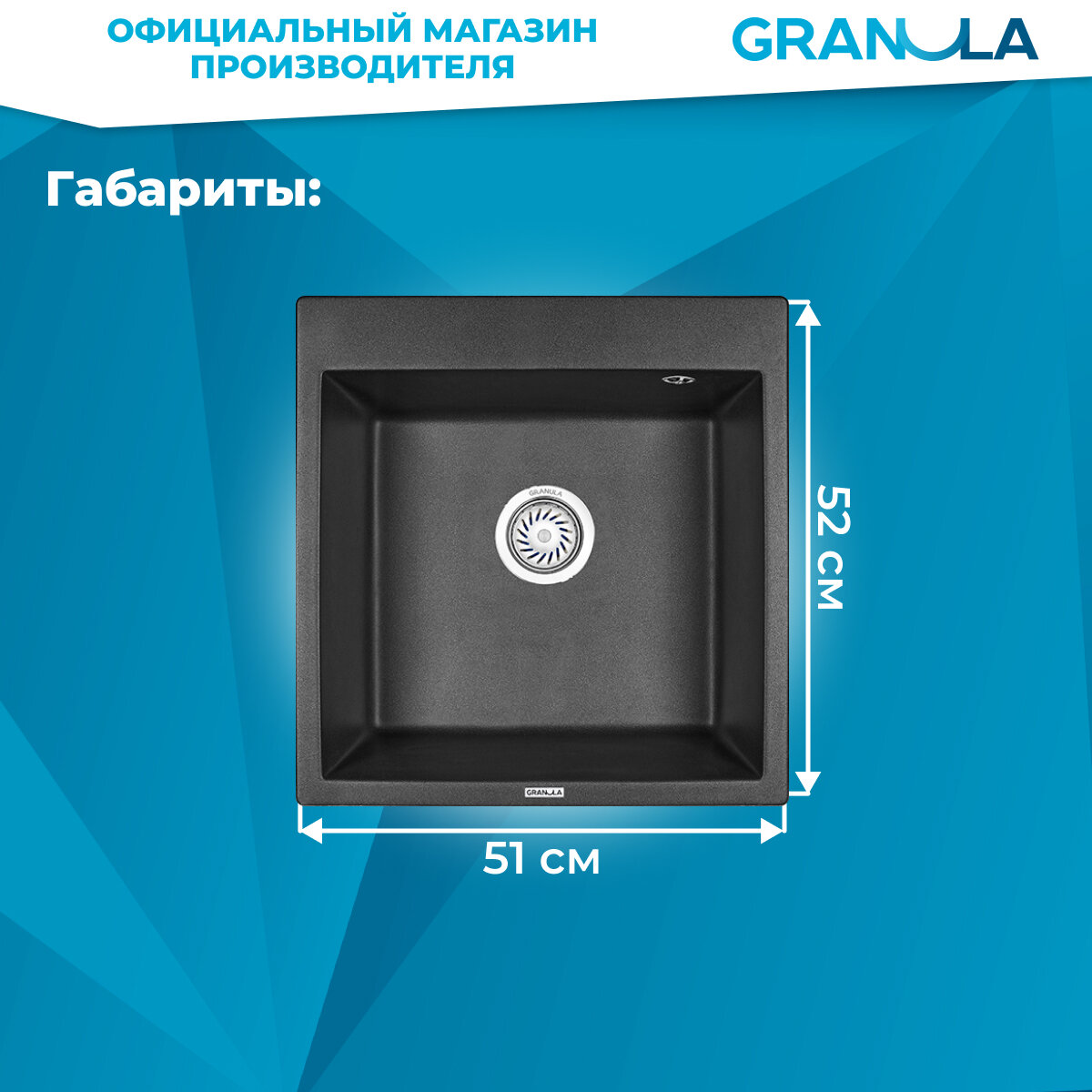 Мойка для кухни врезная кварц GRANULA 51x52x20 Кухонная раковина комплекте с сифоном. Цвет черный