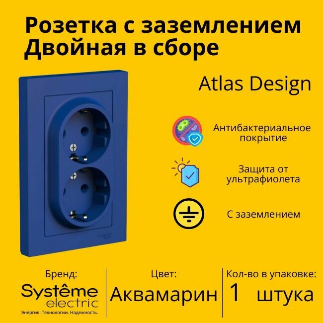 СохранитьРозетка двухместная Systeme Electric Atlas Design с заземлением, в сборе, Аквамарин ATN001124 - 1 шт. интересное: