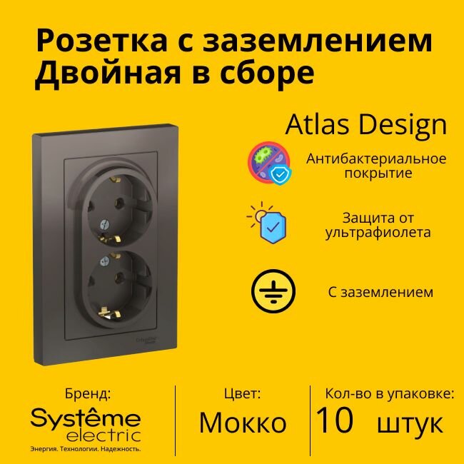 10 шт. Systeme Electric AtlasDesign Грифель, Розетка c заземлением двойная, 16А, в сборе, ATN000724
