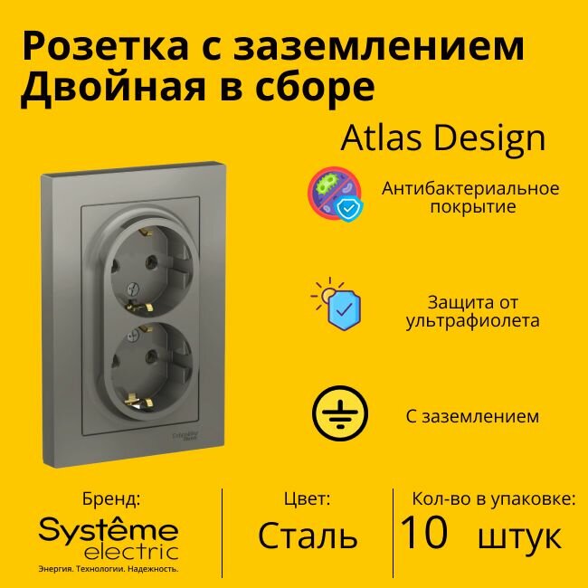 СохранитьРозетка двухместная Systeme Electric Atlas Design с заземлением, в сборе, Сталь ATN000924 - 10 шт. интересное: