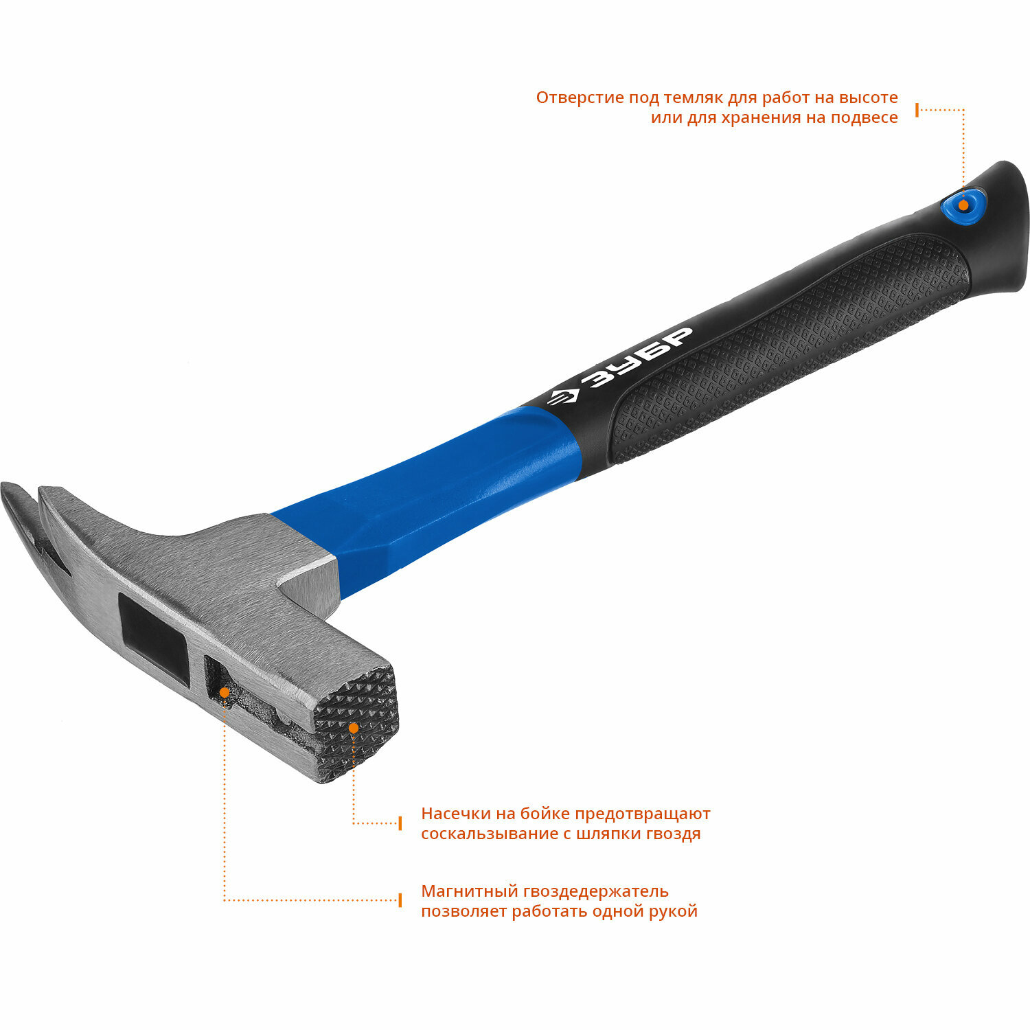 Молоток-гвоздодер с фиберглассовой рукояткой ЗУБР 450 г.