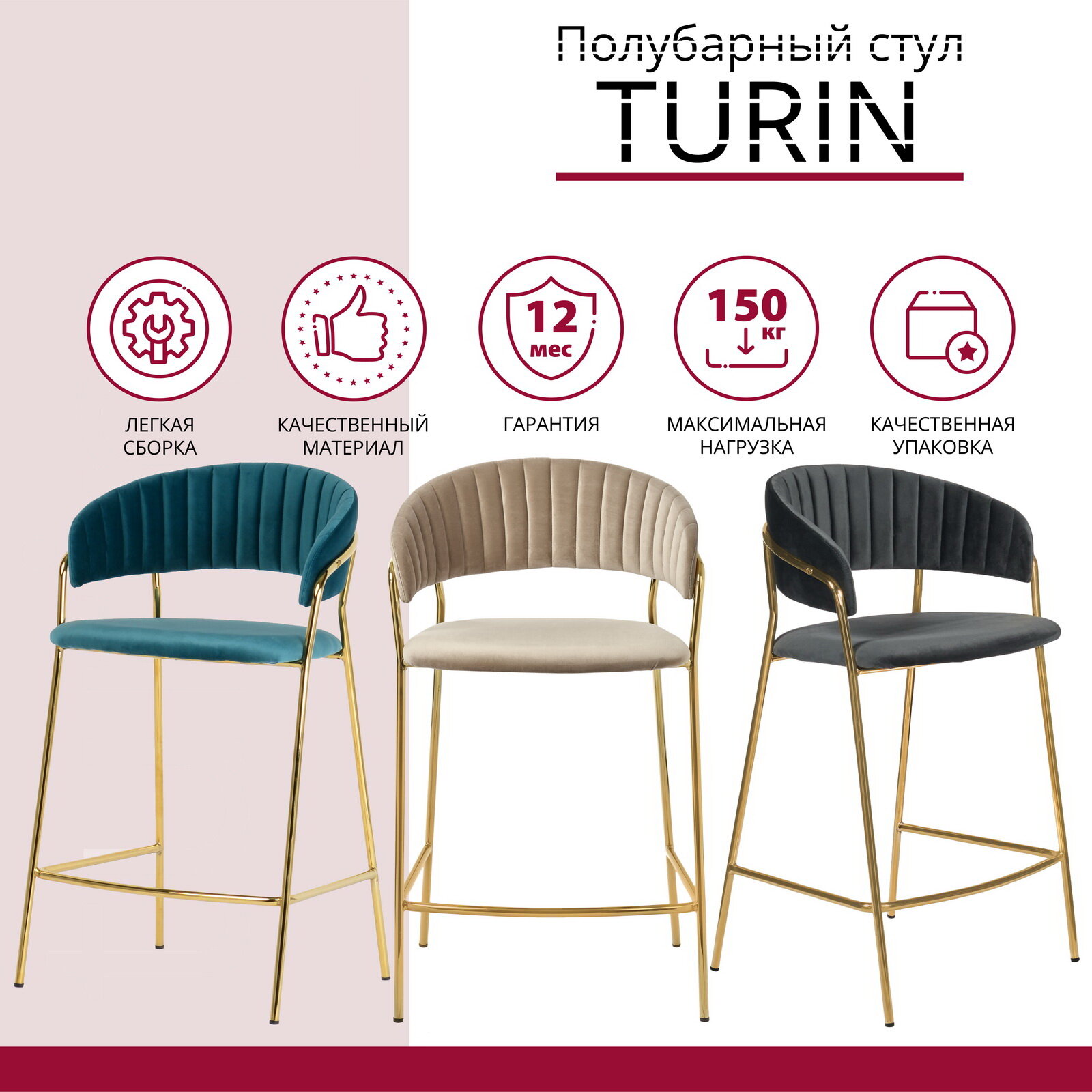 Стул полубарный Turin бирюзовый с золотыми ножками / Барный стул для дома / Стул кухонный со спинкой / Стул велюр / Стулья барные для кухни мягкие