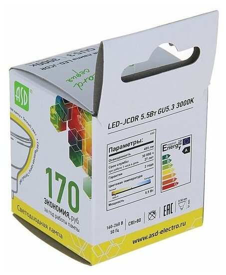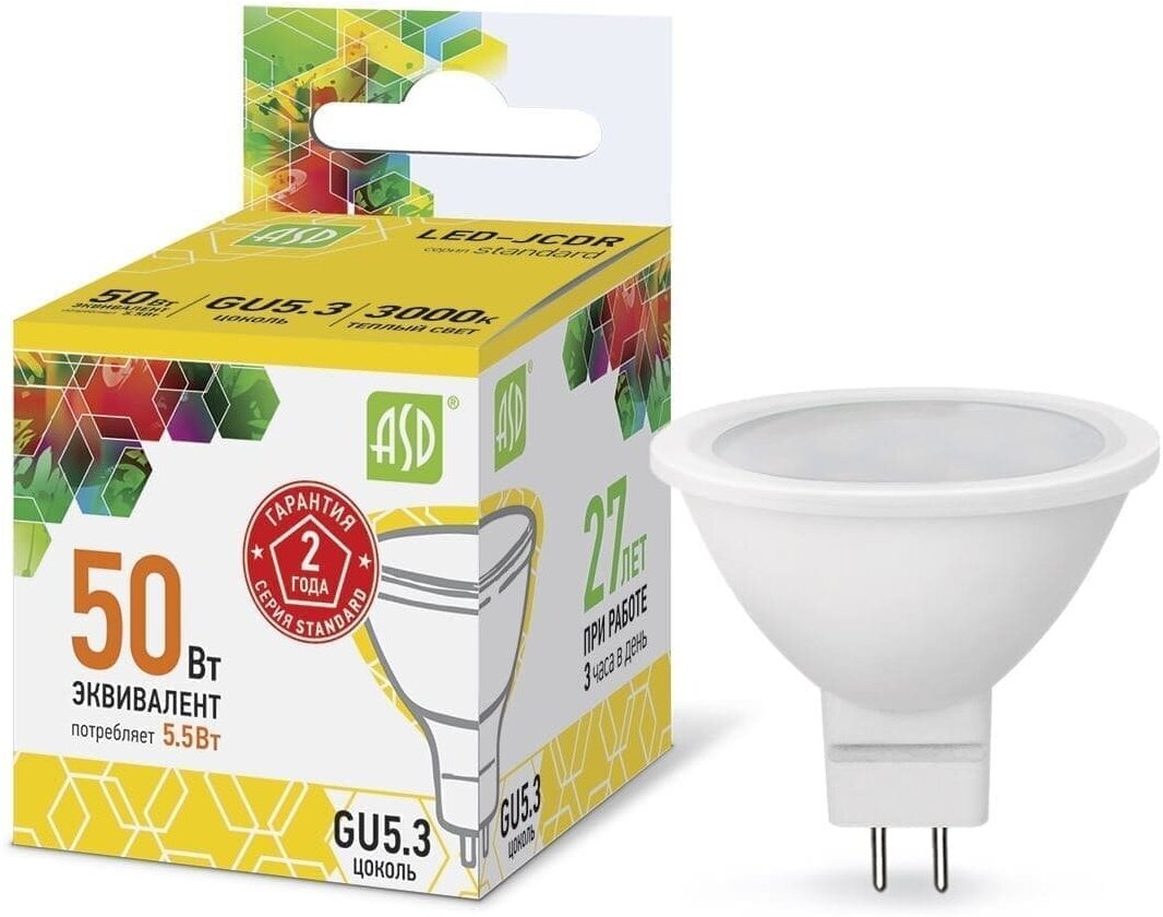 Лампа светодиодная ASD LED-JCDR-STD 3000К, GU5.3, JCDR, 5.5 Вт, 3000 К