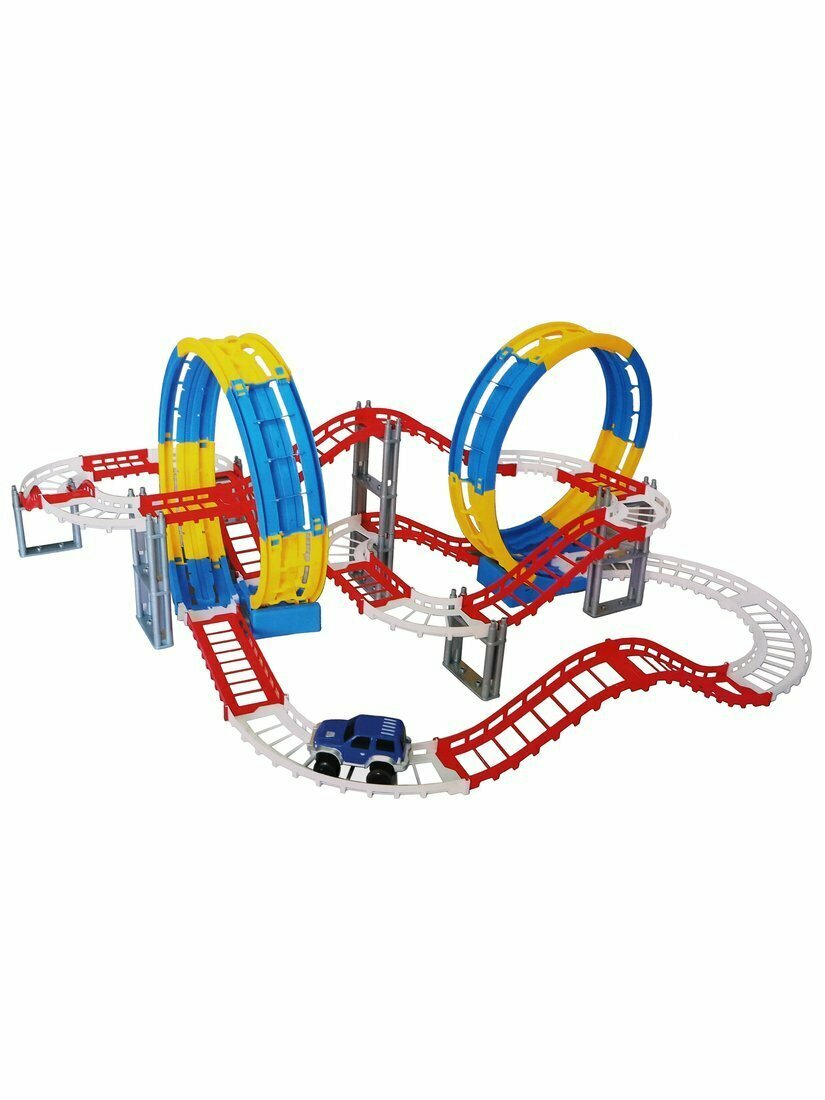 | Комплектация | - 59 деталей для сборки автодороги; - 2 элемента «мёртвая петля»; - 1 машинка. |
