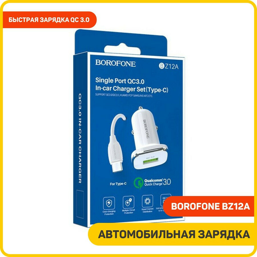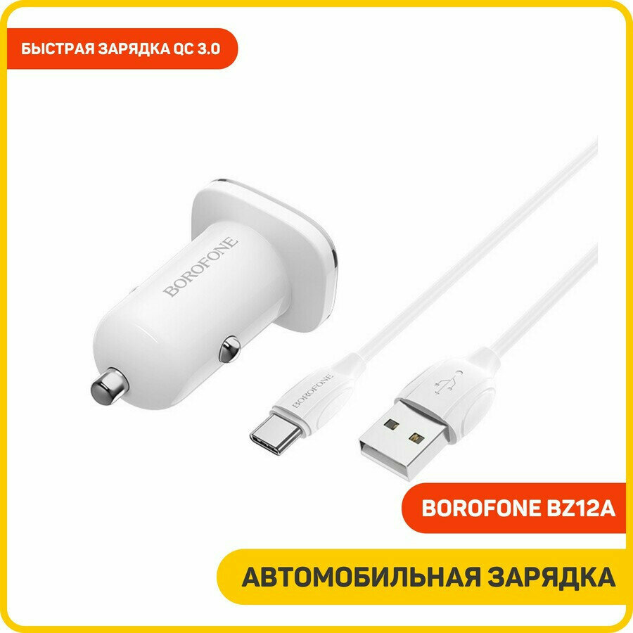 Автомобильное зарядное устройство (АЗУ) Borofone BZ12A QC 3.0 (USB) + кабель Type-C, 3 А, белый