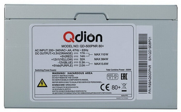 Блок питания 500 Вт ATX Qdion QD-500PNR, 120 мм, 80 Plus