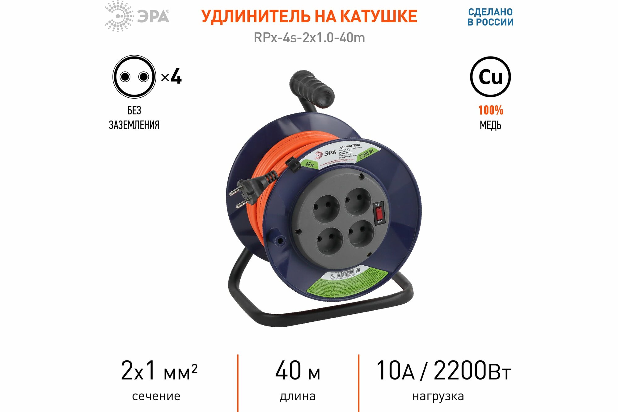 Удлинитель на катушке 4гн без З/К 40м пластик ПВС 2х1 RPx-4s-2x1.0-40m ЭРА