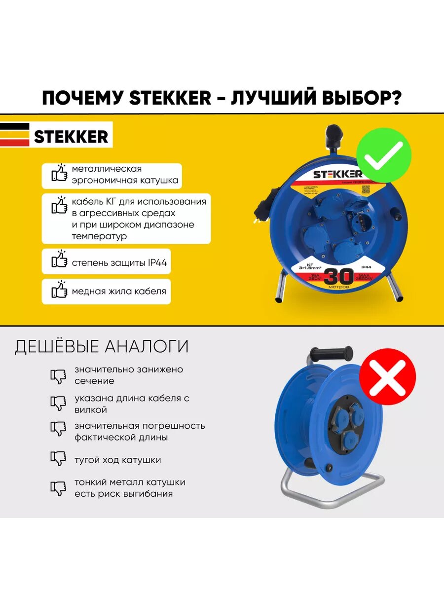 Удлинитель на металлической катушке STEKKER PRF02-41-30 с заземлением, 30м, 3х2,5 морозостойкий, Professional, синий 39296