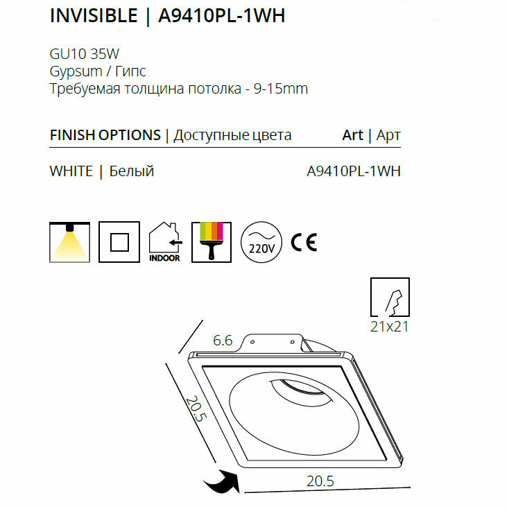 Светильник встраиваемый Arte Lamp INVISIBLE A9410PL-1WH