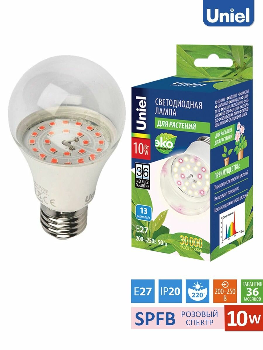 Типы/Лампочки/Технические Uniel LED-A60-10W/SPFR/E27/CL PLP01WH Лампа светодиодная для растений. Форма "A", прозрачная колба. Картон. ТМ Uniel