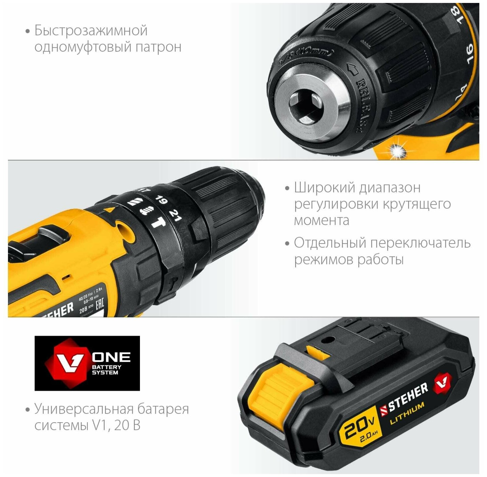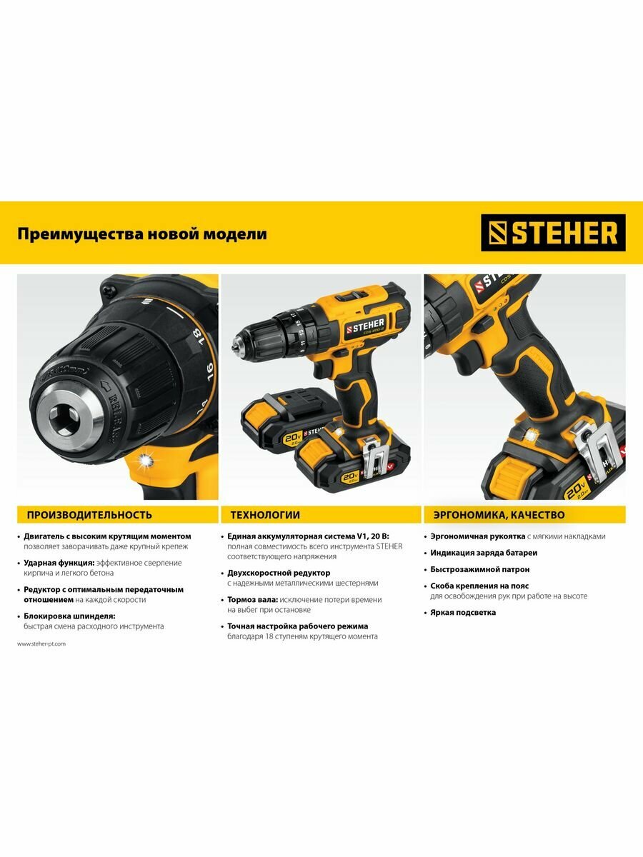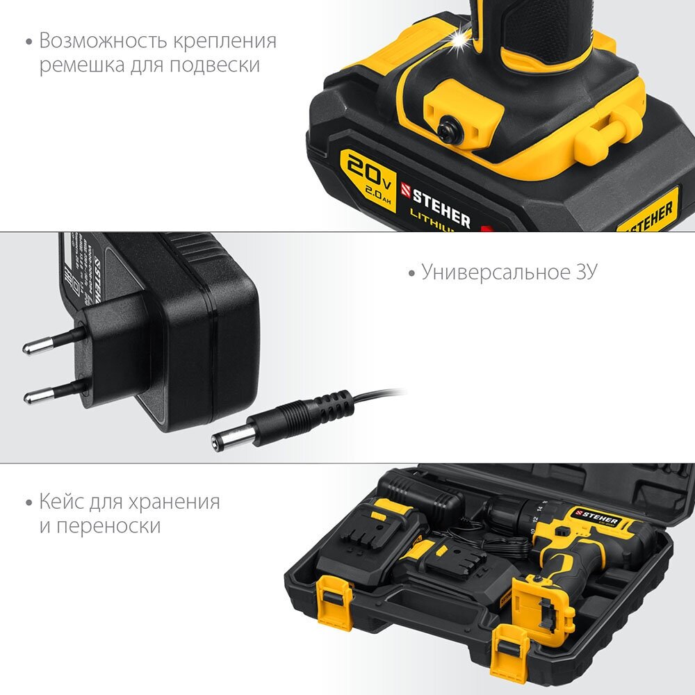 Ударная дрель-шуруповерт, CDS-200-2 STEHER 20 В, 2 АКБ (2Ач), в кейсе интересное: