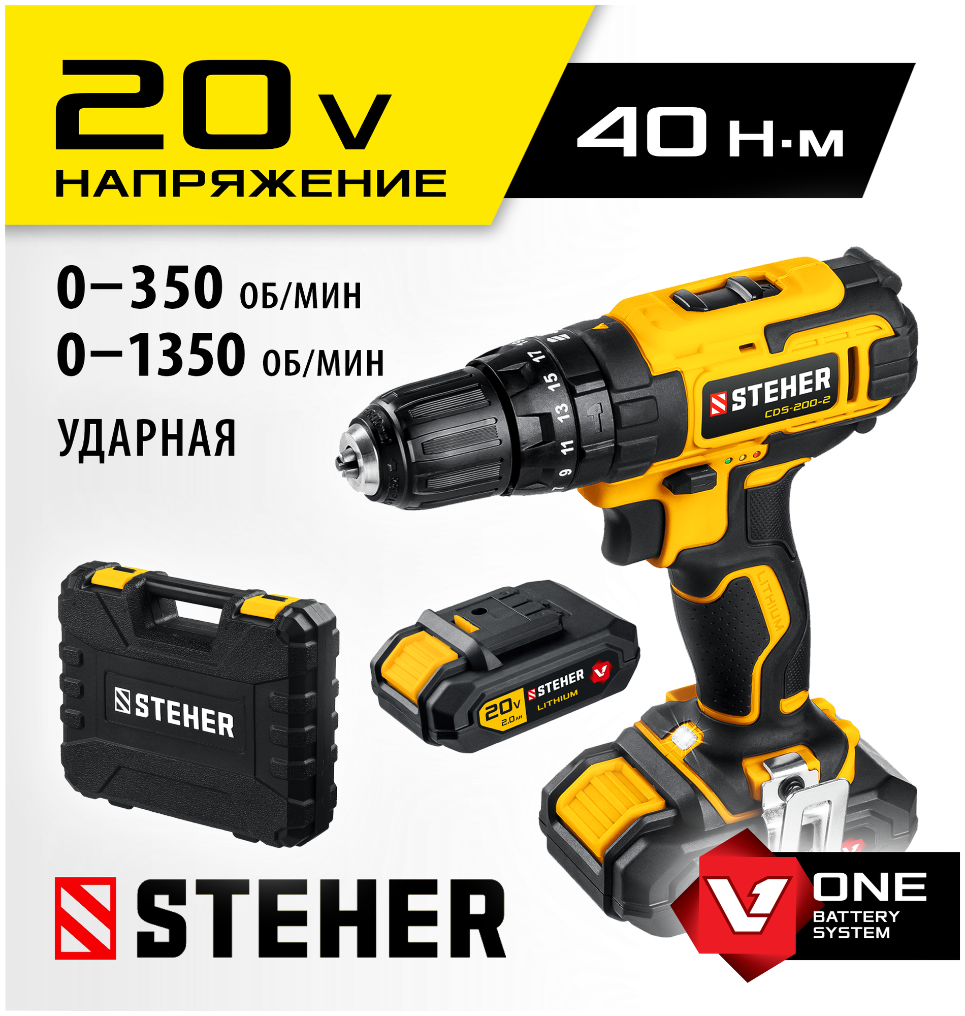 STEHER V1, 20 В, 40 Н·м, 2 АКБ (2 А·ч), ударная дрель-шуруповерт, кейс (CDS-200-2)