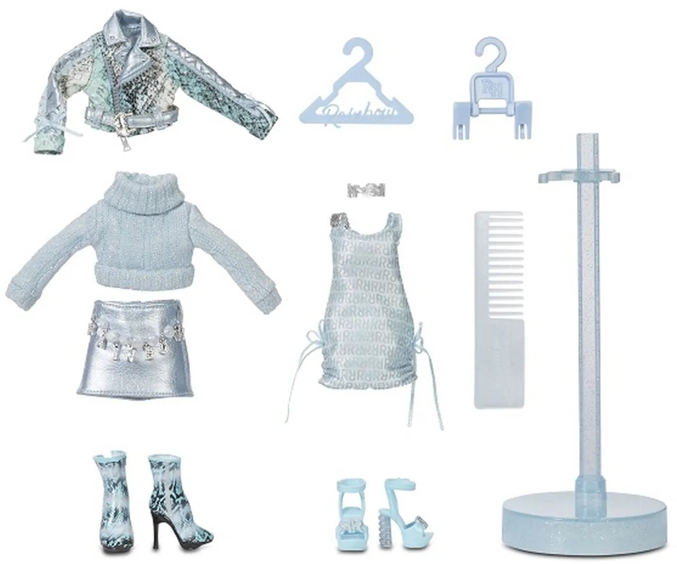 | Комплектация | подставка для куклы, 2 комплекта одежды, 2 комплекта обуви, вешалки для одежды, расческа, модные аксессуары |