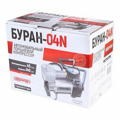 Компрессор авто БУРАН-04N Мощность 140 Вт, Давление 7Атм, Ток 14А, Напряжение 12В, Максимальная производительность 45 л/мин БУРАН-04N 7Атм 14А 45л/мин SKYWAY S02001006