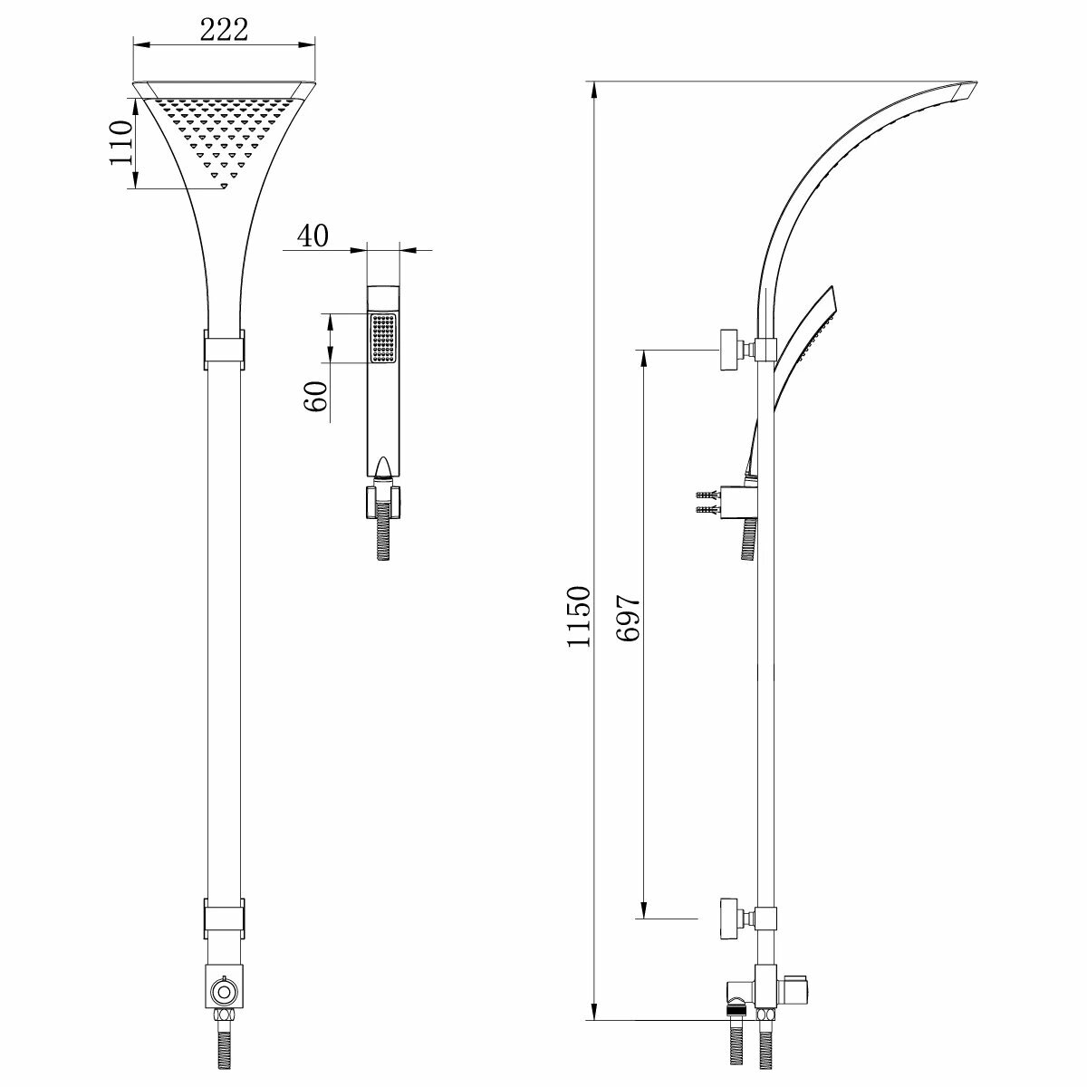 | Дополнительная информация | высота стойки для душа: 1150 мм; длина верхнего душа: 110 мм; ширина верхнего душа: 220 мм |