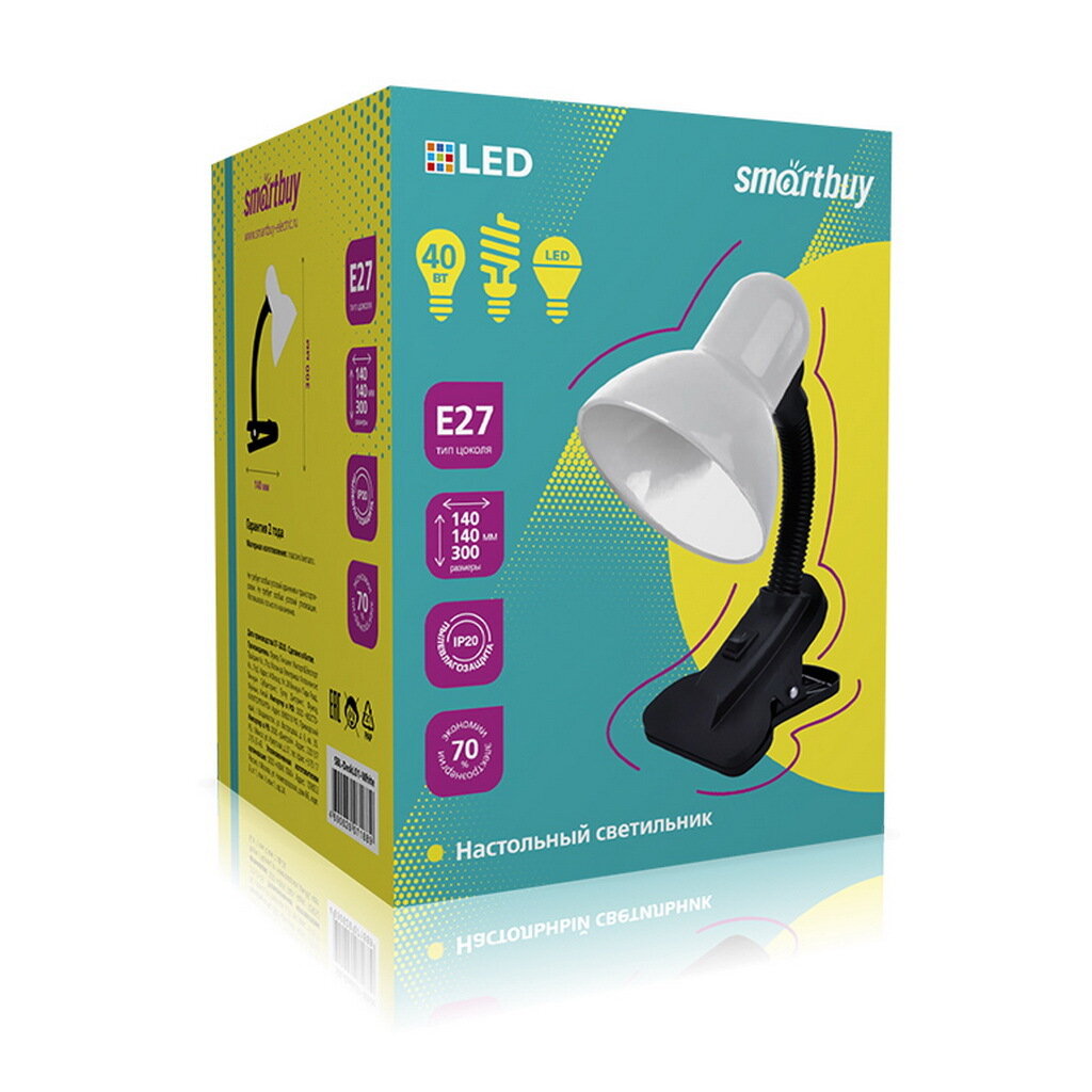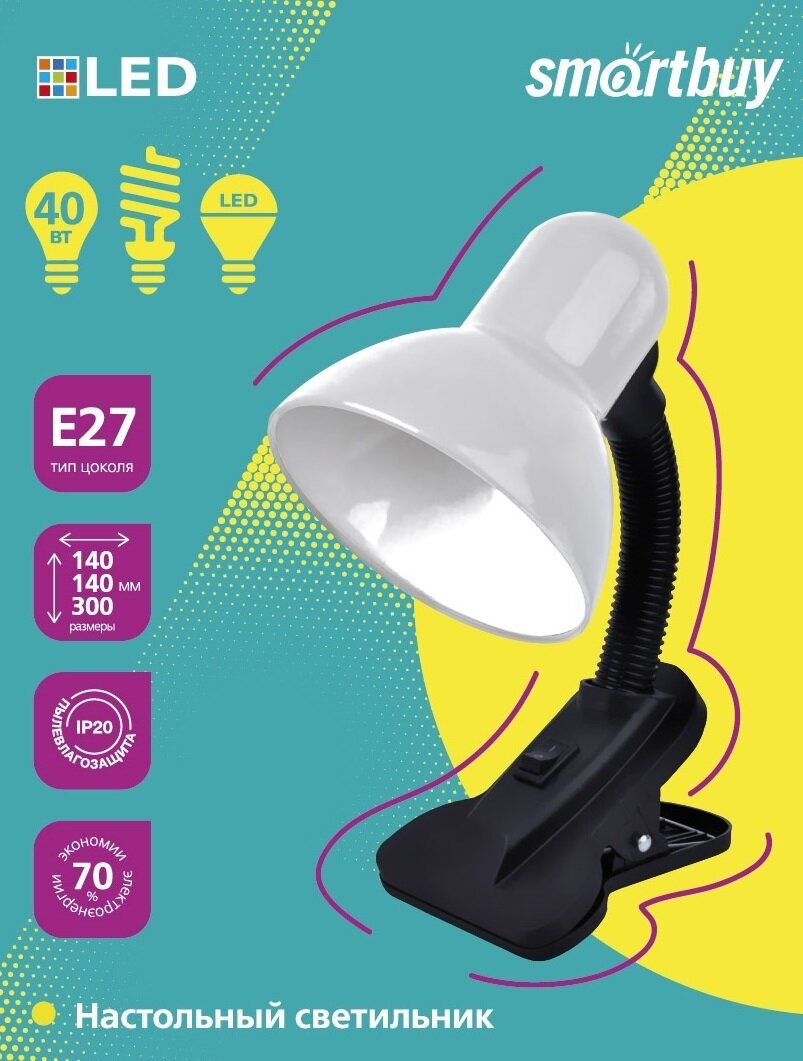Настольный светильник Smartbuy Е27 с прищепкой белый, в пакете